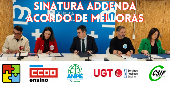 ✍️ CCOO Ensino, ANPE, CSIF e UGT-SP asinamos coa Consellería unha addenda ao Acordo sobre medidas de mellora para impulsar a súa aplicación efectiva e mellorar as condicións de traballo do profesorado.